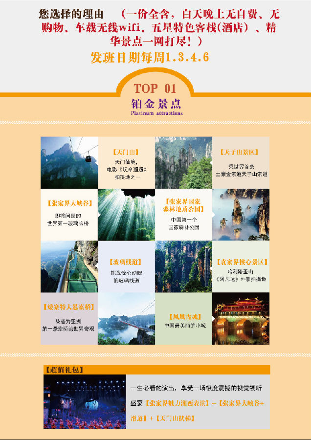 1、包含含行程內(nèi)所有景點(diǎn)門票,索道、纜車和小交通(備注:贈送項目無優(yōu)免、無退費(fèi),晚會不看不退費(fèi)用,亦不做等價交換);